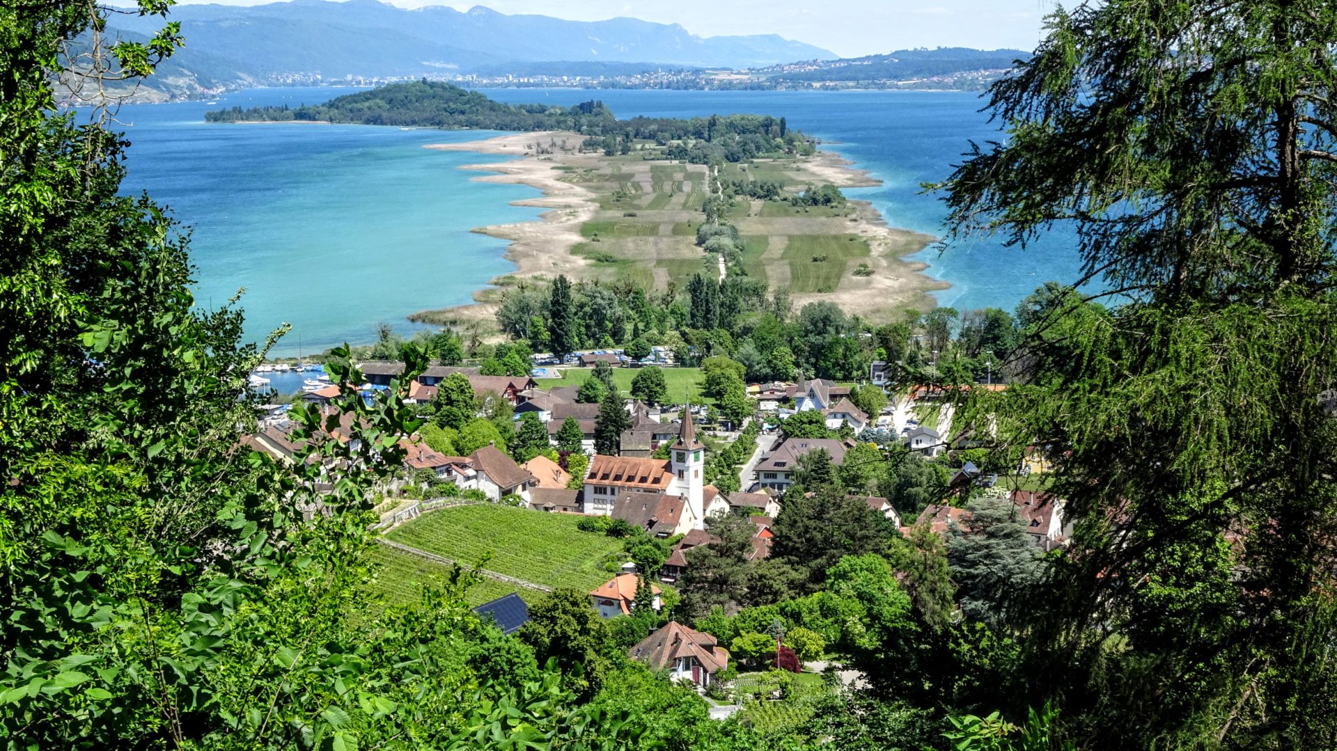 Nous traversons le village d’Erlach et poursuivons direction Tschugg au bord des vignes et des cultures du printemps. Après une courte visite du parque animalier, nousmontons au Jolimont (581 m). Un peu plus loin au Burgerwald, une jolie cabane nous accueille pour le pique-nique. Ensuite la marchecontinue à travers la forêt par Tüfelsburdi et contourne le Jolimontguet (547 m). Par une descente courte mais intense (vue magnifique sur le lac de Bienne et l’Île Saint-Pierre), le